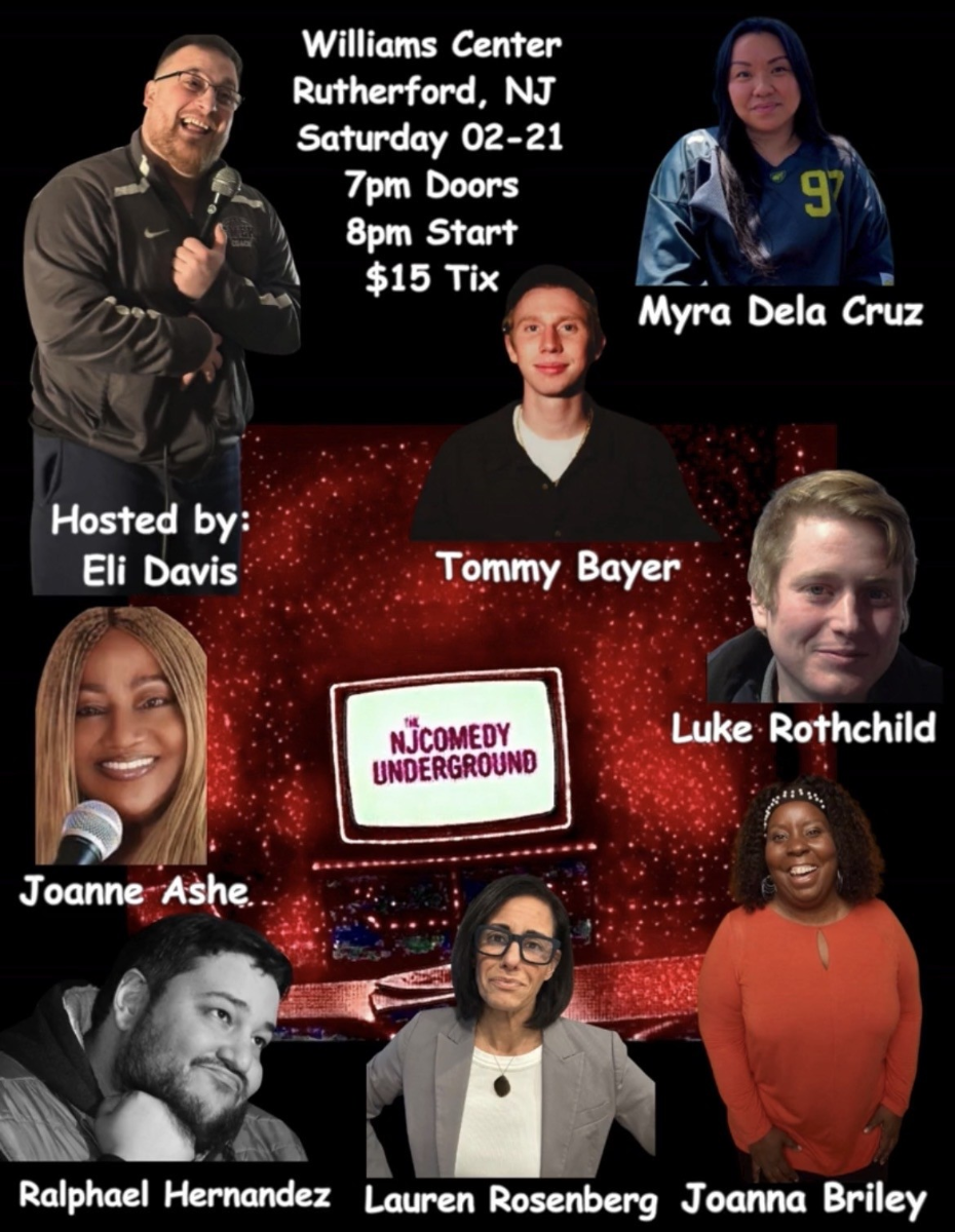 The Williams Center Theater and the NJ Comedy Underground proudly present: Hosted By Eli Davis Joanne Ashe Tommy Bayer Joanna Briley Lauren Rosenberg Luke Rothchild Myra Dela Cruz Headliner – Raphael Hernandez ~ Cash Bar Available ~